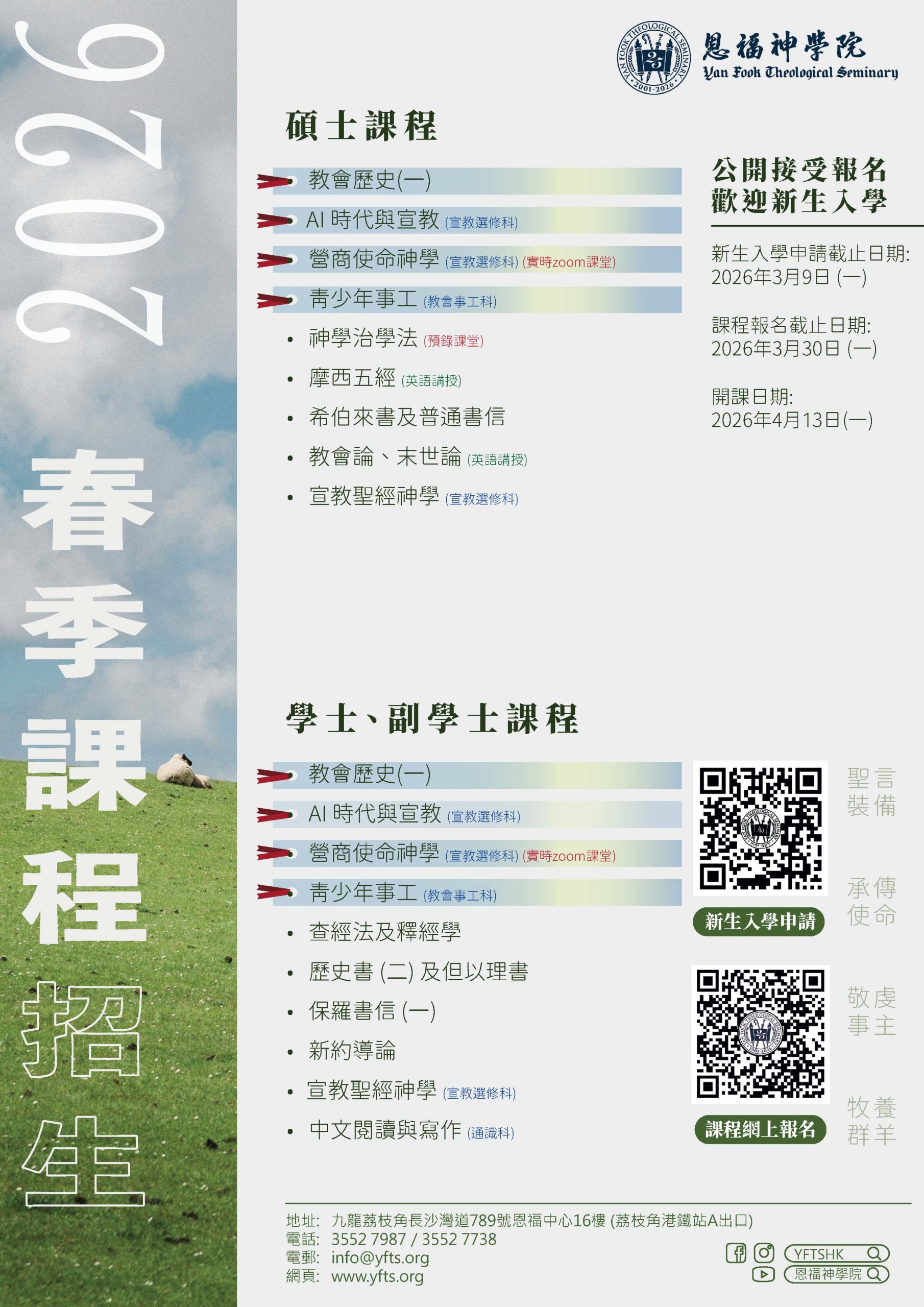 2026春季課程 現正接受報名 新生遞交入學申請截止日期:3月9日(一) 課程截止報名日期:3月30日(一) **本院課程只供已入學之學員報讀 開課日期:4月13日(共十週) 報名同時須繳交$100註冊費。3月31日或以後報名須繳交逾期註冊費及特別行政費$200。 4月9日起概不受理報名。 請按此網上報名及繳費 下載報名表網上報名及繳費 Date 2 月 06 2026 - 4 月 08 2026 Ongoing... Location 恩福神學院 Category 最新消息-首頁