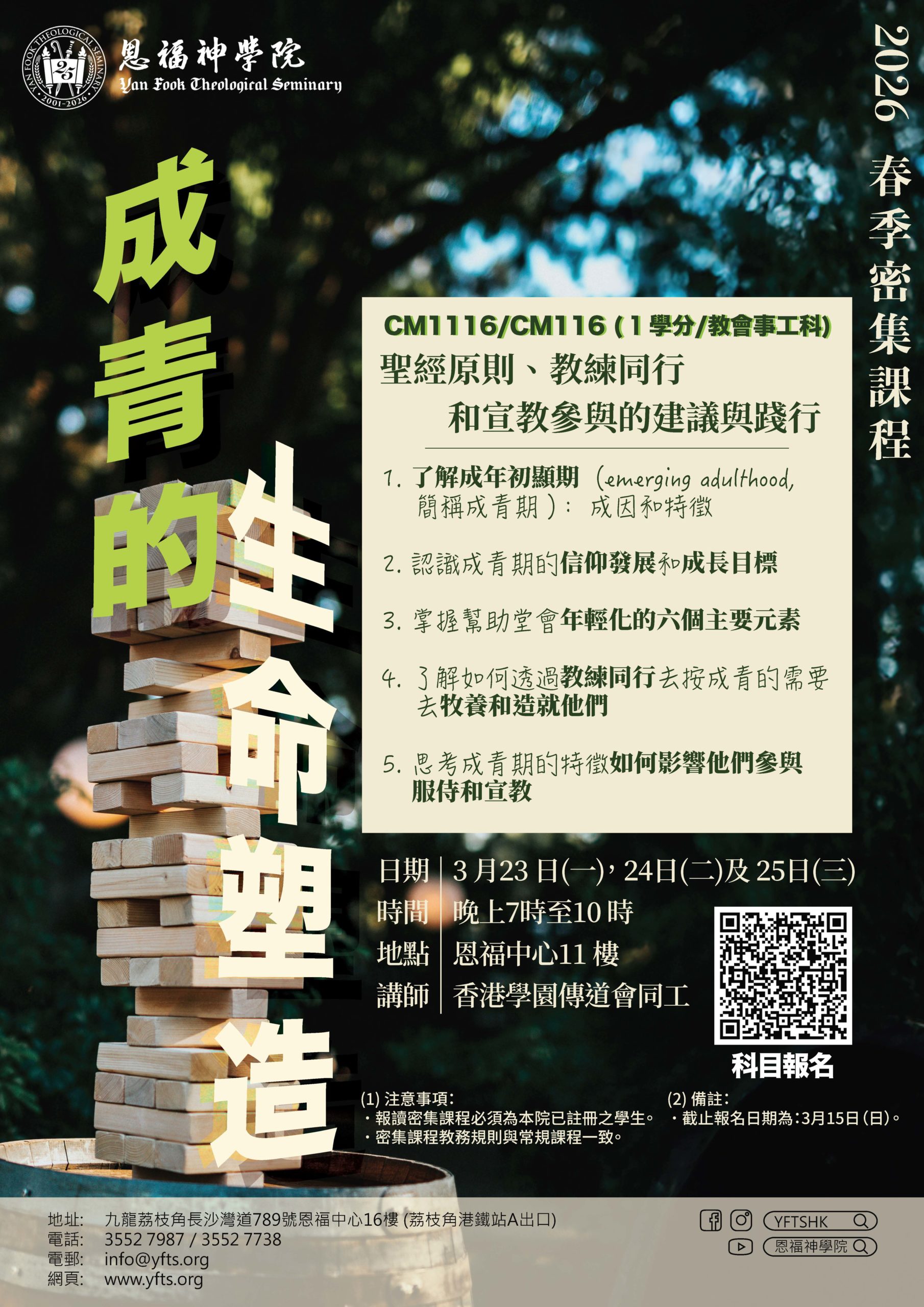 2026春季密集課程 – 成青的生命塑造 *報讀密集課程必須為本院已註冊之學生* CM1116/CM116 〈成青的生命塑造〉(1學分) (教會事工科) 講師:香港學園傳道會同工 授課形式:實體授課 日期:3月23(一)、24(二)及、25日(三) 時間:晚上7時至10時 地點:恩福中心11樓 本科截止報名日期 : 3月15日 (日) 報名須同時繳付註冊費$100 下載報名表網上報名及繳費 Date 1 月 19 2026 - 3 月 15 2026 Ongoing... Location 恩福神學院 Category 最新消息-首頁