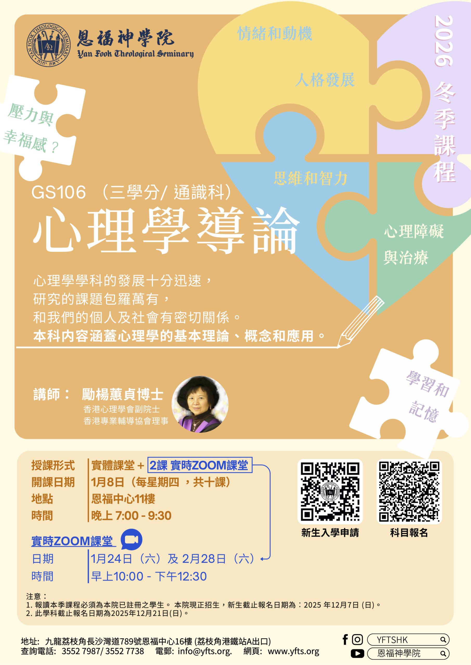 2026冬季課程 心理學導論 科目簡介: 心理學學科的發展十分迅速, 研究的課題包羅萬有, 和我們的個人及社會有密切關係。 本科內容涵蓋心理學的基本理論、概念和應用。 此科目為實體課堂,另加2課實時ZOOM課堂 開課日期:1月8日(四) 講師:勵楊蕙貞博士 🌐報讀此科目:https://www.yfts.org/application/ ⚠️注意事項 1. 只供本院已註冊學生報讀 2. 截止報讀日期︰12月21日 報讀此科目 Date 11 月 04 2025 - 12 月 30 2025 Ongoing... Location 恩福神學院 Category 最新消息-首頁