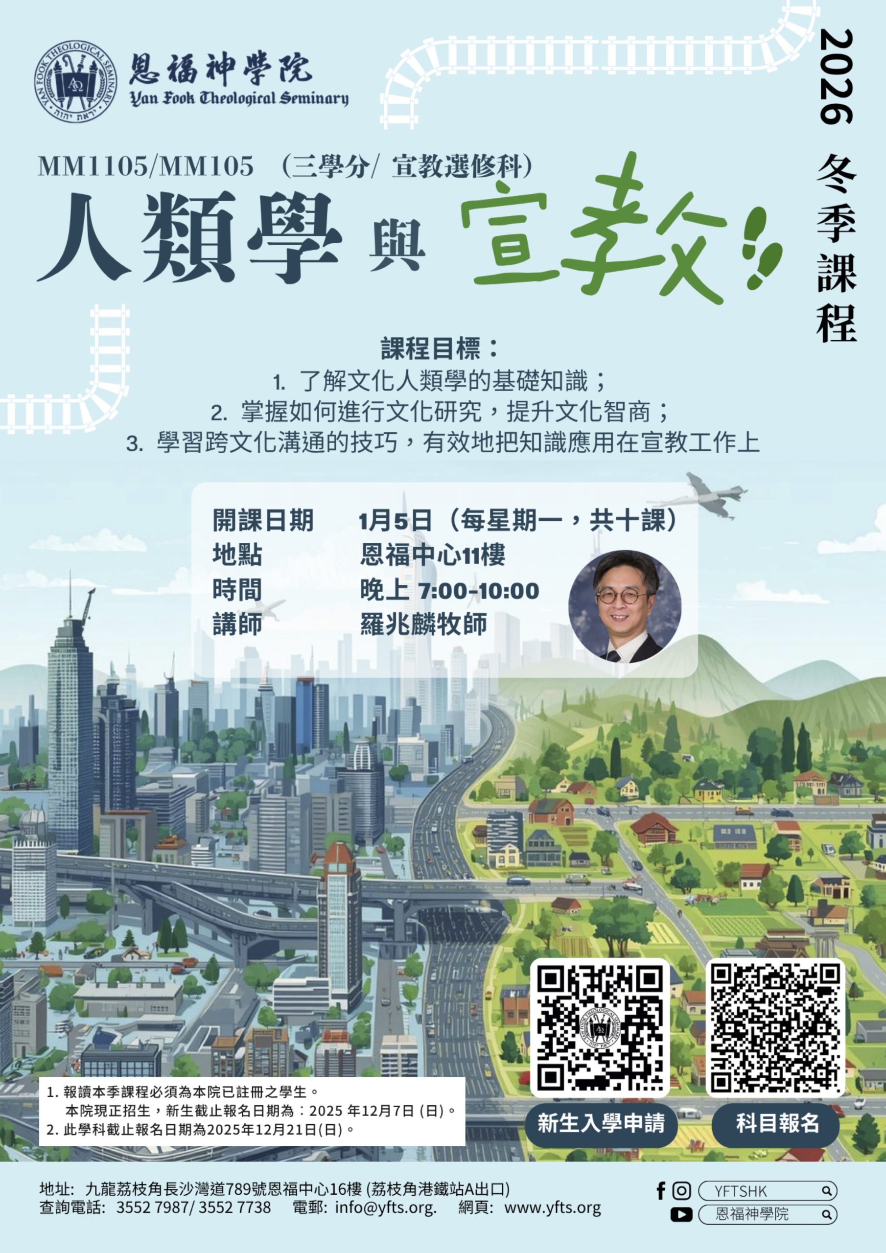 2026冬季課程 人類學與宣教 科目簡介: 1. 了解文化人類學的基礎知識; 2. 掌握如何進行文化研究,提升文化智商; 3. 學習跨文化溝通的技巧,有效地把知識應用在宣教工作上。 此科目為實體課堂 開課日期:1月5日(一) 講師:羅兆麟牧師 🌐報讀此科目:https://www.yfts.org/application/ ⚠️注意事項 1. 只供本院已註冊學生報讀 2. 截止報讀日期︰12月21日 報讀此科目 Date 11 月 04 2025 - 12 月 30 2025 Ongoing... Location 恩福神學院 Category 最新消息-首頁