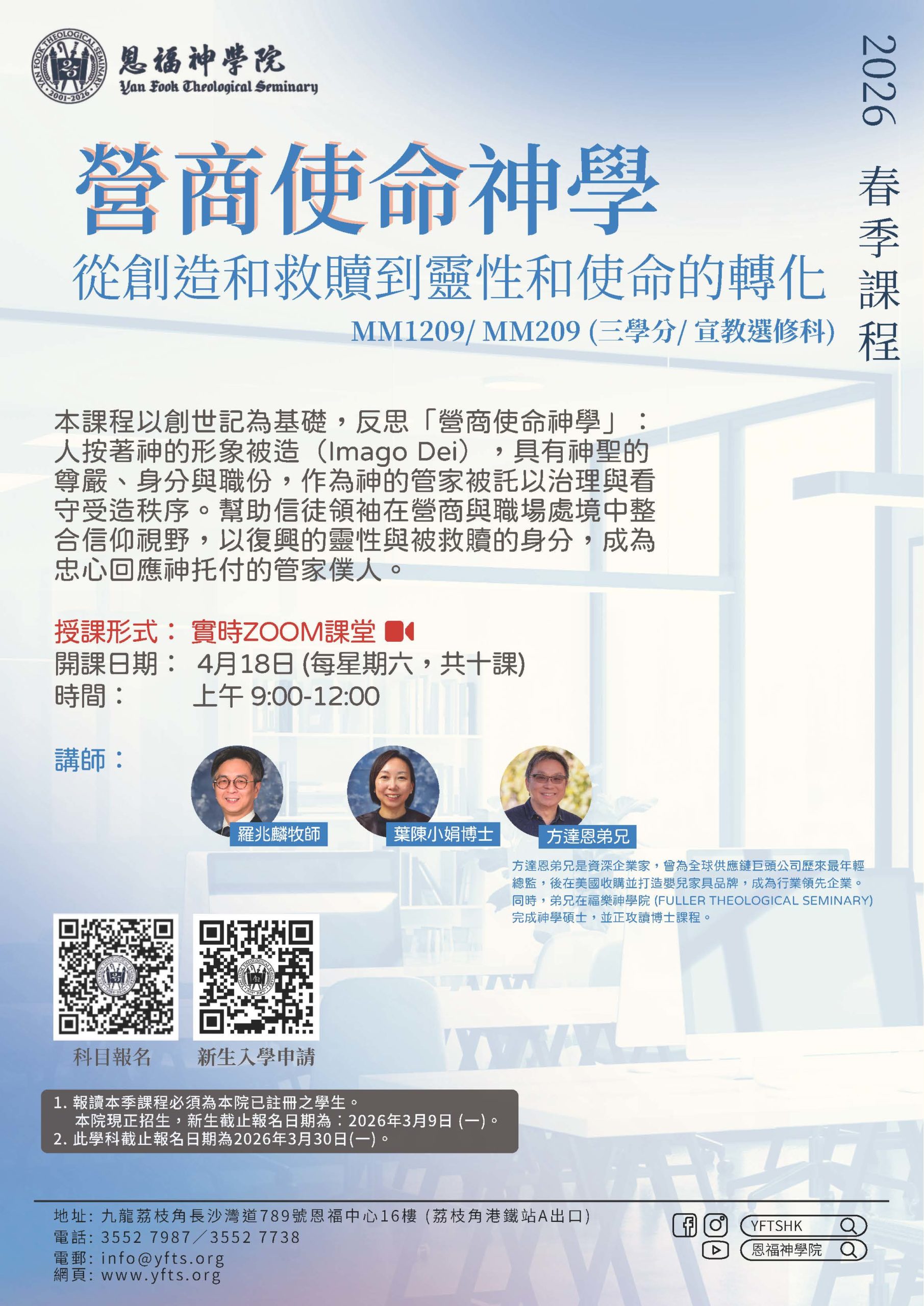 2026春季課程 營商使命神學 科目簡介: 本課程以創世記為基礎,反思「營商使命神學」:人按著神的形象被造(Imago Dei),具有神聖的尊嚴、身分與職份,作為神的管家被託以治理與看守受造秩序。幫助信徒領袖在營商與職場處境中整合信仰視野,以復興的靈性與被救贖的身分,成為忠心回應神托付的管家僕人。 此科目為 實時ZOOM 課堂 開課日期:4月18日(六) 講師:羅兆麟牧師、葉陳小娟博士、方達恩弟兄 🌐報讀此科目:https://www.yfts.org/application/ ⚠️注意事項 1. 只供本院已註冊學生報讀 2. 截止報讀日期︰3月30日 報讀此科目 Date 3 月 12 - 30 Ongoing... Location 恩福神學院 Category 最新消息-首頁