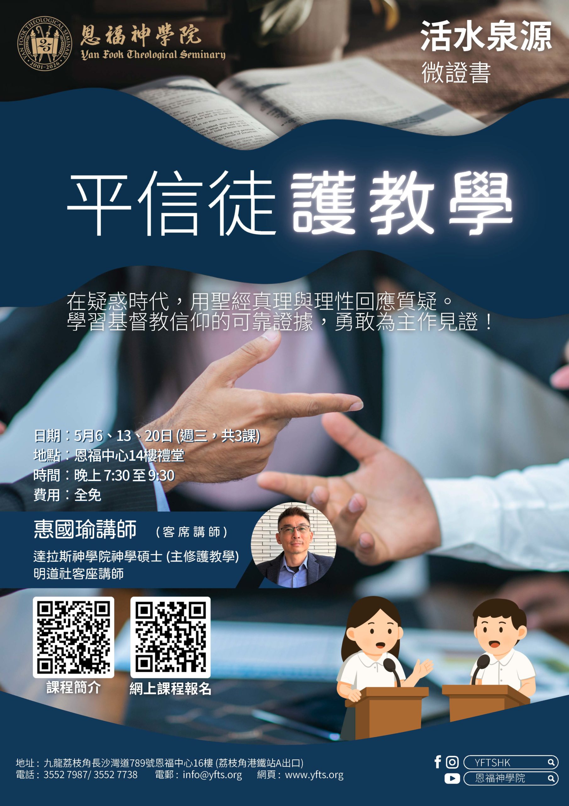 活水泉源微證書課程 – 平信徒護教學 在疑惑時代,用聖經真理與理性回應質疑。 學習基督教信仰的可靠證據,勇敢為主作見證! 日期︰5月6、13、20日 (週三,共3課) 時間︰晚上 7:30 至 9:30 地點︰恩福中心14樓禮堂 講員:惠國瑜講師(客席講師) 請按此網上報名 Date 5 月 06 - 20 Location 恩福神學院 Category 最新消息-首頁
